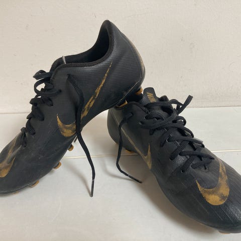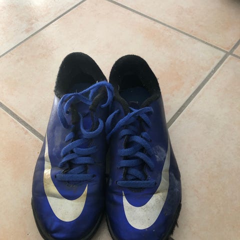 Nike fodboldstøvler til børn i to farver: et par sorte og et par røde. Begge par er lukkede modeller uden snørebånd med knopper under sålen, velegnet til brug på græsbaner. Overdelen er i syntetisk materiale, og designet har Nike-logo på sider og forfod.