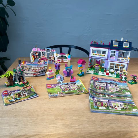LEGO Friends byggesæt. Sættet indeholder forskellige LEGO Friends klodser, skinner, plader og tilbehør samt instruktionshæfter, som ses på billederne. Egnet til leg og opbygning af forskellige Friends-scener og miljøer afhængigt af de medfølgende dele.