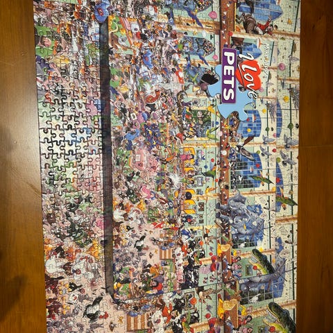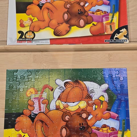 Garfield puslespil med 99 brikker. Motivet viser Garfield og en hund i farverigt streetwear-miljø. Illustration fra 1998 Paws, licenseret gennem CTM Merchandising. Velegnet som underholdning for børn og samlere af Garfield-merchandise.