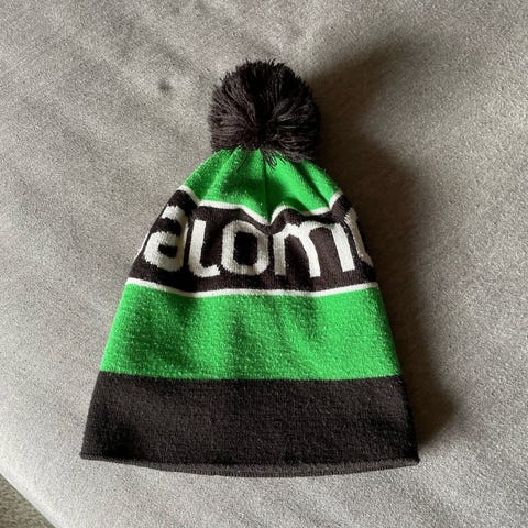 Salomon one size. Huen er turkis med hvidt mønster og har ribkant forneden.