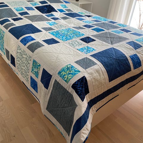 Patchwork tæppe i rosa:laksefarve nuancer med blomstermønstrede felter. Tæppet er syet i geometriske blokke med skiftevis ensfarvede og mønstrede stykker, som danner et klassisk patchworkdesign. Forsiden består af rosa felter kombineret med stof med store blomster og blade i dæmpede farver. Bagsiden fremstår ensfarvet rosa. Velegnet som babytæppe i eller som dekorativt tæppe over sofa eller seng.