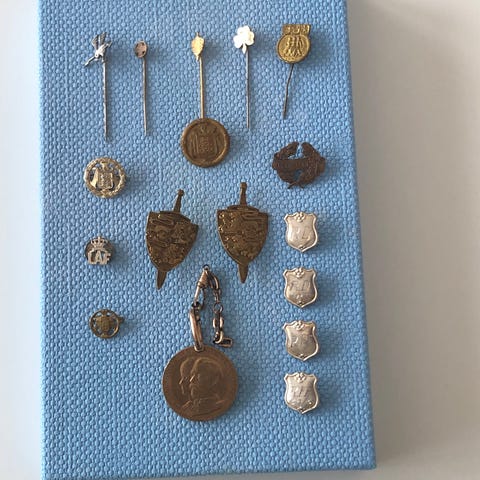 Blandede emblemer og pins i forskellige motiver, størrelser og farver. Udvalget omfatter blandt andet nationale flag, organisationsemblemer, logoer og dekorative symboler. Velegnet til samlere eller som pynt på tøj, tasker eller opslagstavler. Sælges enkeltvis efter aftale om pris pr. stk.