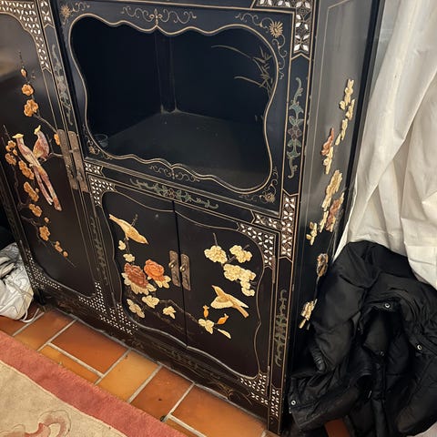 Skab i træ med sort og rød bemaling og orientalske motiver på lågerne. Skabet har flere sektioner med låger både øverst og nederst, som giver god opbevaringsplads til fx tøj, bøger eller andre genstande. Dekorative paneler på fronten viser detaljerede scener og blomster. Velegnet som opbevaringsmøbel i stue, soveværelse eller entré. Mål 195 x 110 x 60 cm.