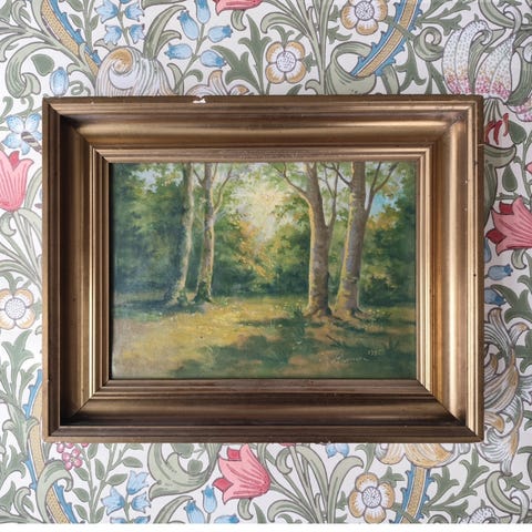 Fin, gammel maleri fra midten af det 20. århundrede. Maleriet er et oliemaleri af et skovlandskab med mørke, krogede træer, udført i en naturalistisk eller tidlig modernistisk stil. Rammen er en træramme i rødlige og guld nuancer. Maleriet er signeret TR.