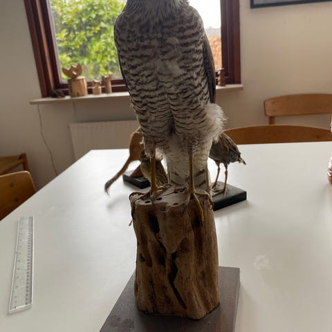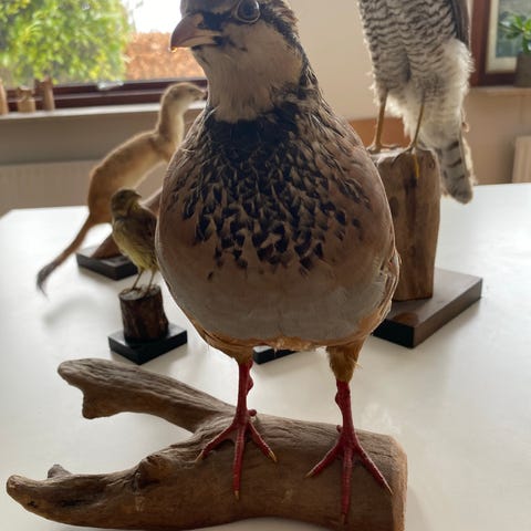Udstopppet fugl på lille træ- og træstub-sokkel. Fuglen fremstår i naturlige brune nuancer med stribet fjerdragt. Monteret på firkantet fod med rund træstub som støtte. Egnet som dekorations- eller samlerobjekt, fx til natur- eller undervisningsbrug. Ingen synlige mærker for producent eller modelnavn på genstanden.