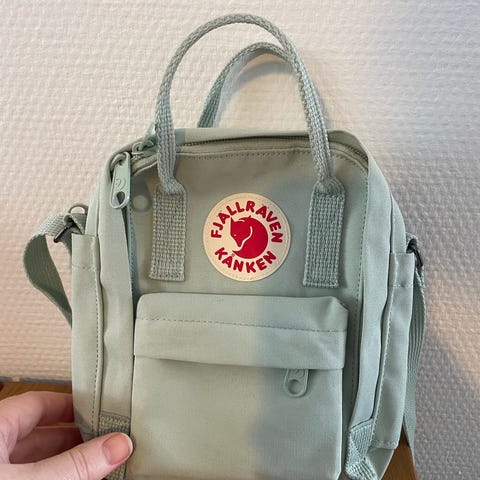 Fin lille Fjällräven Kånken taske. Tasken har et hovedrum med lynlås, indvendig navnelabel og mindre indvendig lomme. Udvendigt er der en frontlomme med lynlås samt to korte bærehanke og justerbar skulderrem, så tasken kan bæres både i hånden og over skulderen.