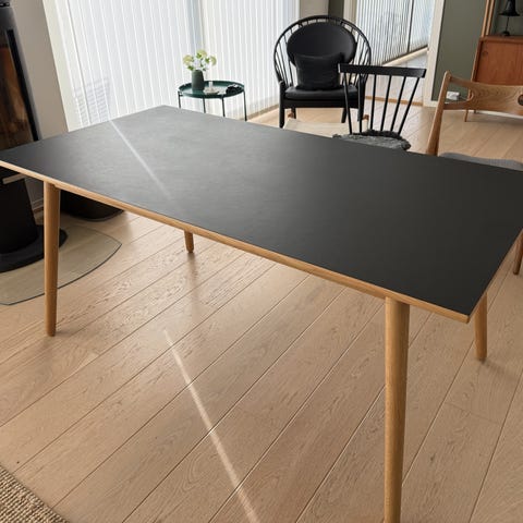 FDB Møblers C35CH spisebord med hollandskudtræk, i lakeret eg. Bordet har et par skrammer som vist på billederne men er ellers i fin stand.