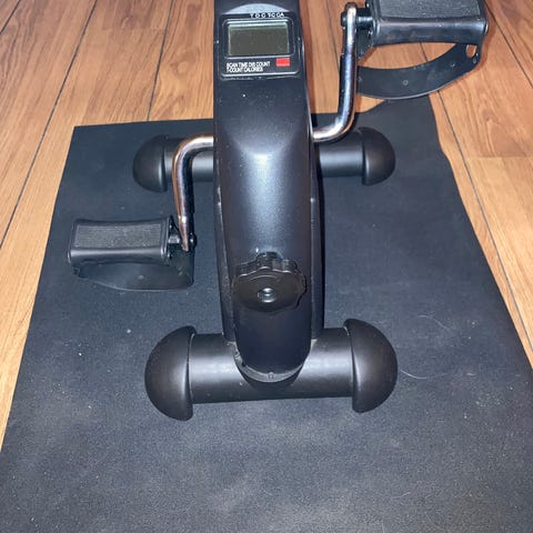 Mini motionscykel med display. Kompakt pedaltræner til brug på gulv eller bord. Udstyret med justerbar modstand, pedaler med remme og lille digitalt display, der kan vise træningsdata som tid og omdrejninger.