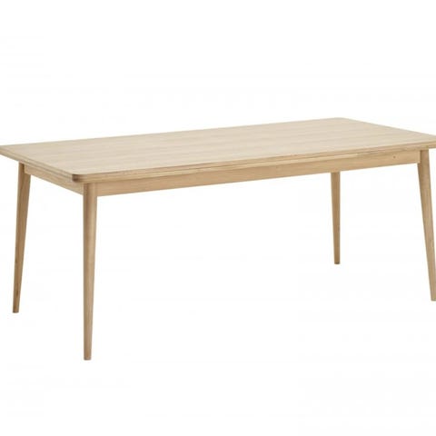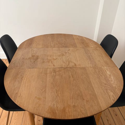 mindre små rander, se sidste billede. Bordet kan slibes utallige gange, blot ny lak og evt. bejdse. Ordet er meget tungt. Udtrækket er også lavet i massivt eg.