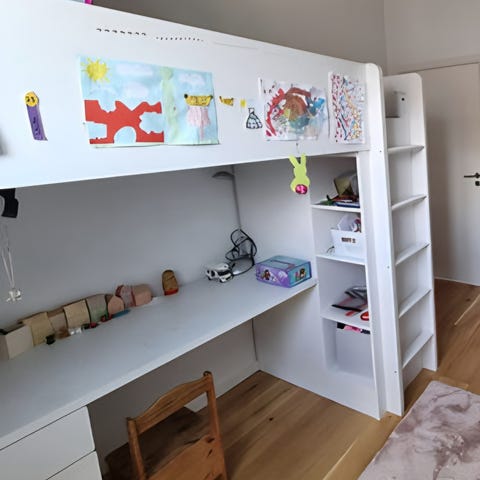 Sengen er velegnet til børneværelse, hvor der er behov for både soveplads, skrivebord og opbevaring til tøj og ting på begrænset plads.