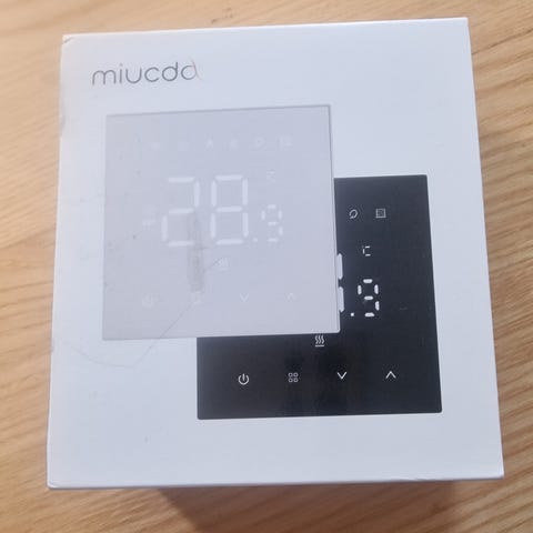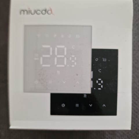 Digital termostat til vægmontering med front i sort og bagside i hvid plast. Enheden har oplyst digitalt display, der viser temperatur i grader, samt tre berøringsknapper til betjening på fronten. Bagsiden har tilslutningsklemmer til kabelføring og montering på væg eller base. Egnet til styring af rumtemperatur i bolig eller kontor, hvor der ønskes digital visning og enkel betjening.