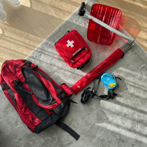 ABS rygsæk lavinerygsæk i orange og grå. Taskerne har polstrede skulderstropper og hoftebælte med spænde. Bagsiden er ventileret med meshpaneler og findes i størrelserne S,M og L ifølge mærkaterne. Velegnet som lavinerygsæk til ski- og snowboardbrug med mulighed for montering af ekstra udstyr efter ABS-systemets standarder. Flere rum og lynlåslommer giver plads til opbevaring af udstyr på tur. Der medfølger 3 kulfiber patroner og 3 håndtag. 1 kulfiber patron er ubrugt.