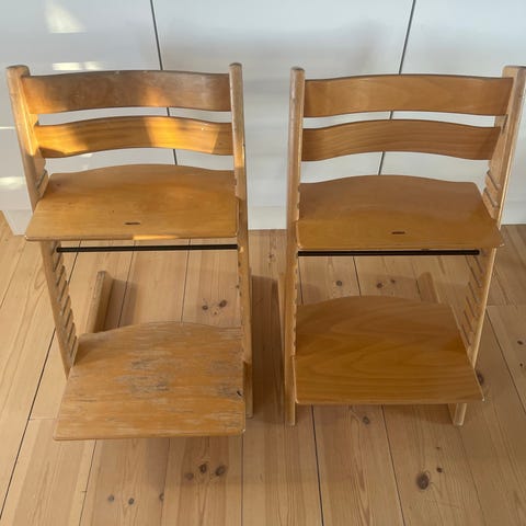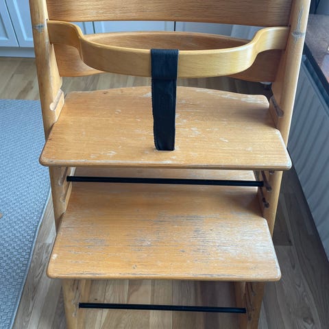 Stokke højstol i træ med justerbar siddeplade og fodplade. Den er malet og afskallet, så man kan bruge den som den er, eller male den igen.