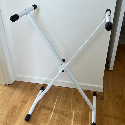Stativ i metal. Foldes fint sammen og står meget stabilt. Justerbart på en række måder.