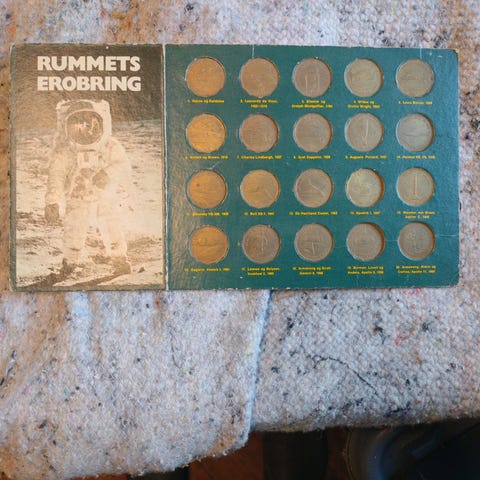 Rummets Erobring møntsamling med medaljer. Samlingen består af en mappe/plade med flere runde medaljer, der illustrerer temaer og begivenheder fra rumfart. Forsiden viser et billede af en astronaut på månen og teksten "Rummets Erobring". Egnet til samlere af mønter og medaljer med rumfarts- eller historisk tema.