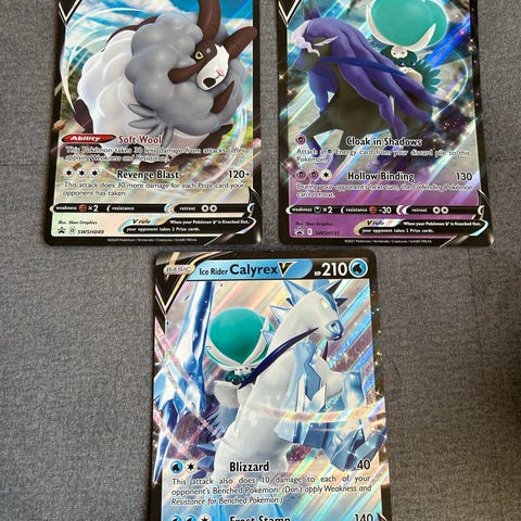 Jumbo / Big cards / store Pokémon kort lot med tre kort: Pikachu V fra Vivid Voltage, Raichu med angrebene Quick Attack og Electric Surfer samt Dragonite EX. Kortene er på engelsk og viser motiverne Pikachu, Raichu (Alolan form) og Dragonite. Egnet til samling eller spil i Pokémon Trading Card Game.