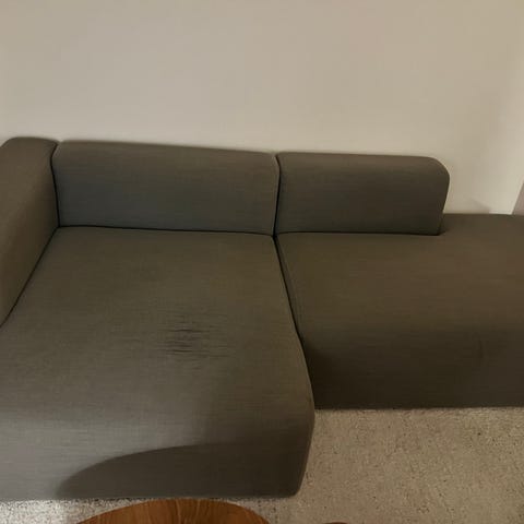 Grundet flytning må vi sælge vores meget fine og dejlige sofa fra Hay. Modellen er Mags. Den har fået en flænge i stoffet på den ene del (se billede) Den har også nogle pletter, som ikke er forsøgt renset. Men ellers står den meget fint og har stadig mange gode år i sig. Vi sælger den derfor også til en god pris. Bud er velkomne.