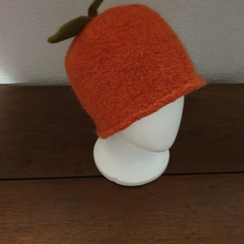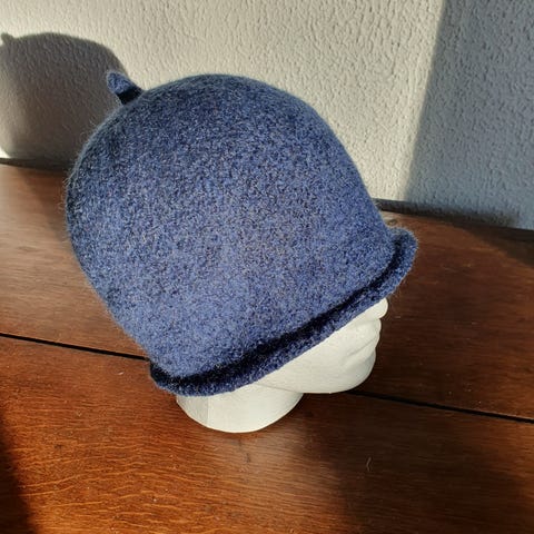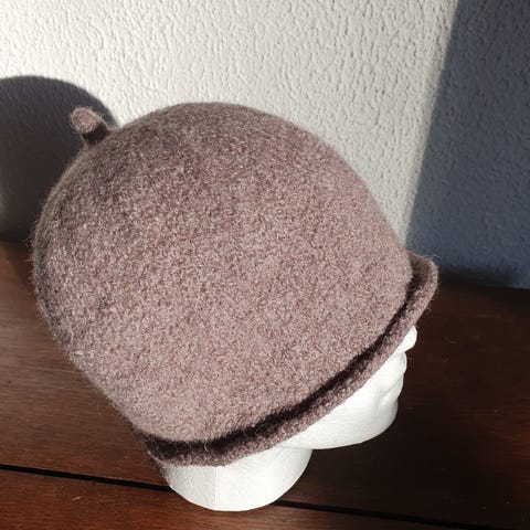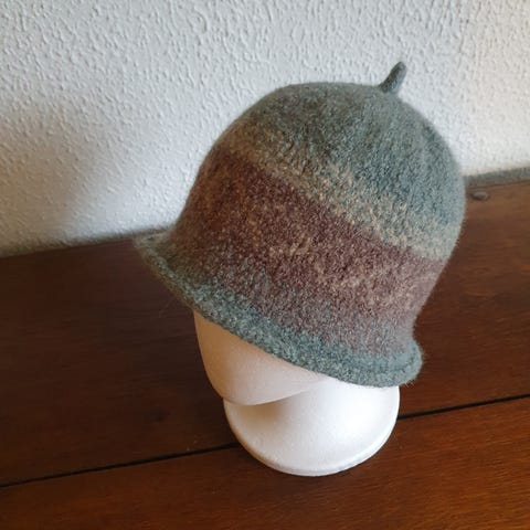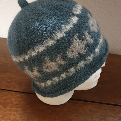 Jeg har strikket huen I 100% uld og filtet den. Beskytter hud og hår I sauna og holder hovedet varmt ved vinterbadning.