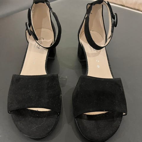 Gabor sandaler i str. 38. Sandalerne er sorte med brede remme over forfoden og om anklen, justerbare med spænde. Indersålen er lys og let polstret, og sålen har en lav hæl med kork-look. Velegnet som hverdagssandal i sommerhalvåret.