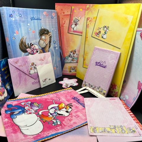 Diddl samling bestående af klistermærker og samlebøger. Motiverne viser Diddl-figurer i forskellige farverige scener. Klistermærkerne er anbragt i mapper/bøger med plastlommer til opbevaring. Egnet til samlere af Diddl-merchandise eller til kreativ brug som pynt i breve, notesbøger og scrapbøger.