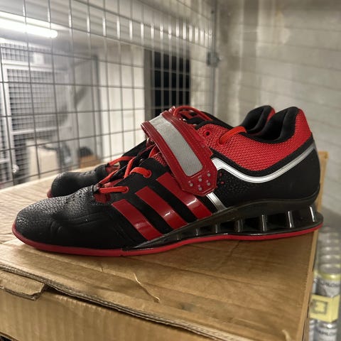 Adidas vægtløftersko i størrelse 46. Skoene er i hvid med sorte striber og har snørelukning kombineret med velcrorem over vristen for ekstra støtte.