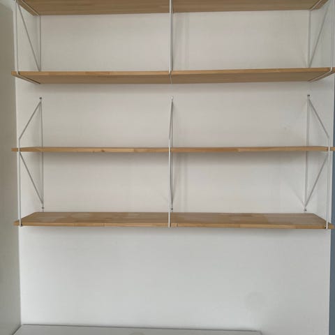2 hylder i teak. Hvidmalet hyldeknægte og spejl
