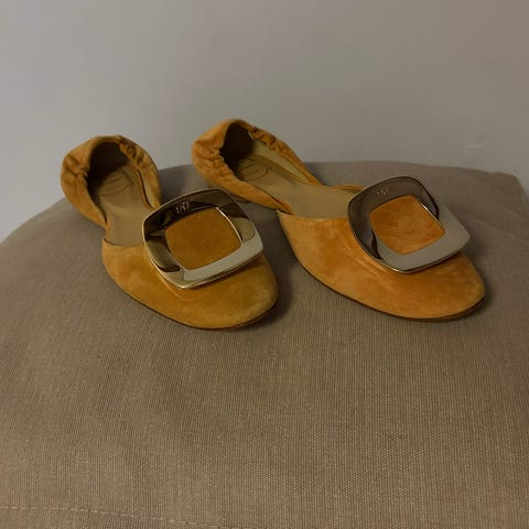 Smukke ballerina-sko fra Roger Vivier i blødt ruskind med det karakteristiske firkantede metalspænde. Klassisk og tidløst design, der passer til både hverdag og pænere brug.