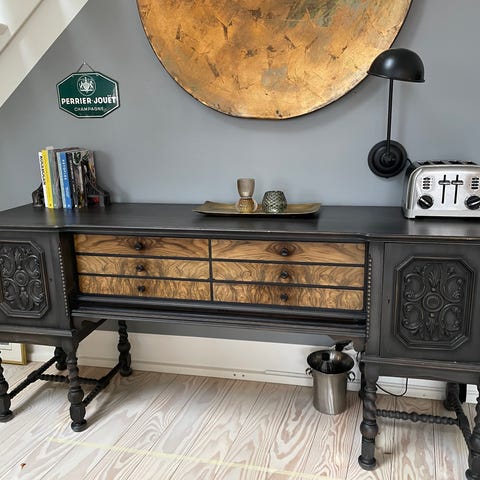 Vi fandt et ægte antikt køkkenskænk her i Danmark, der er kendetegnet ved sit enkle design, men samtidig besidder en nostalgisk charme. Den underspillede stil komplementeres af små messinggreb. Vi renoverede det danske skænk fuldstændigt og malede det i "Moss"-farven fra Paint of Walinoon. Det lyse, sandbeige interiør hedder "Forest Beige", og vi forseglede begge kridtmalinger med vores møbelvoks. Farverne opfrisker skænken uden at forringe dens karakter. Den har nu et raffineret, naturligt, skandinavisk look, der kan kombineres med mange indretningsstile.