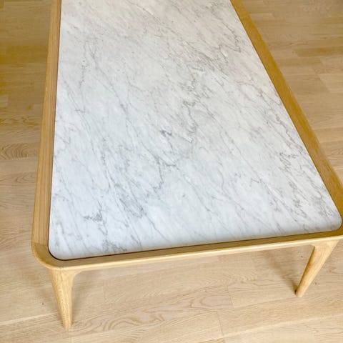 Hübsch Raw sofabord. Sofabordet har en kvadratisk bordplade i sort marmor med lyse årer og et stel i egetræ. Kombinationen af marmor og træ giver et roligt og enkelt udtryk, der kan indgå i mange typer indretning. Bordet er egnet som sofabord i stue eller opholdsrum og giver en plan og robust overflade til fx bøger, dekoration eller servering.