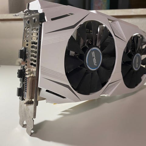Asus Dual GeForce RTX grafikkort i sort. Kortet har dual-fan køleløsning og leveres i original emballage som vist på billederne. Velegnet til stationær pc med PCIe-slot og understøtter flere skærmtilslutninger via de viste videoporte. Grafikkortet er egnet til gaming og grafisk arbejde afhængigt af den specifikke RTX-model og systemets øvrige hardware.