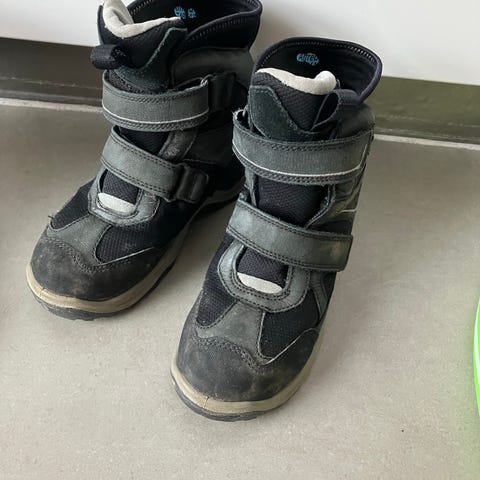 ECCO drengestøvler i mørkeblå farve. Støvlerne har to velcrolukninger over vristen for nem af- og påtagning. Overdelen er i tekstil med forstærkninger ved tå og hæl, og sålen er lys med mønster for bedre fodfæste.