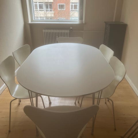 Piet Hein superellipse spisebord + fire stk. Arne Jacobsen 7’er stole.