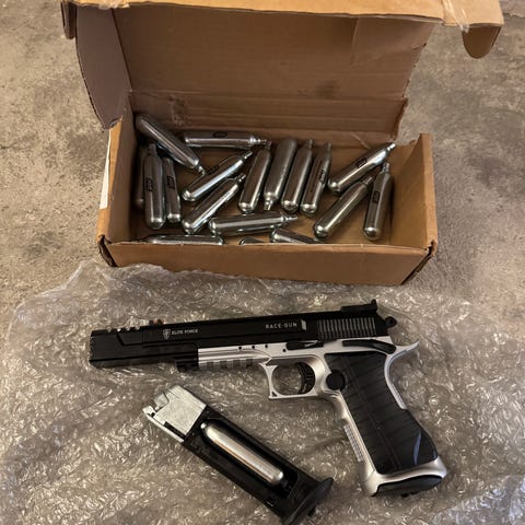 Der medfølger 31 co2 patroner, hylster til pistol, hurtig lader, skyde skiver og holder, kugler.