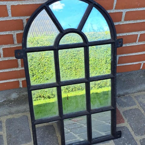 Fritstående spejl med metalstel. Spejlet er rektangulært og monteret på en gulvramme, så det kan stå frit i rummet. Bagsiden har kroge til ophæng af mindre genstande. Egnet som helkropsspejl i soveværelse, entré eller garderobe.