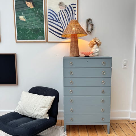 Kommoden er malet i en flot støvet blå/grøn farve med fine håndmalede ornamenter på skufferne og varme trædetaljer langs kanterne.