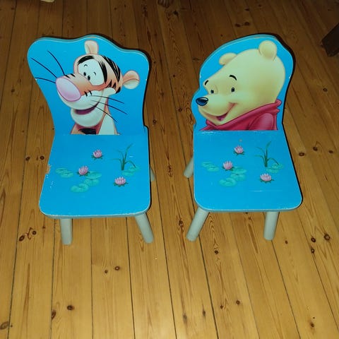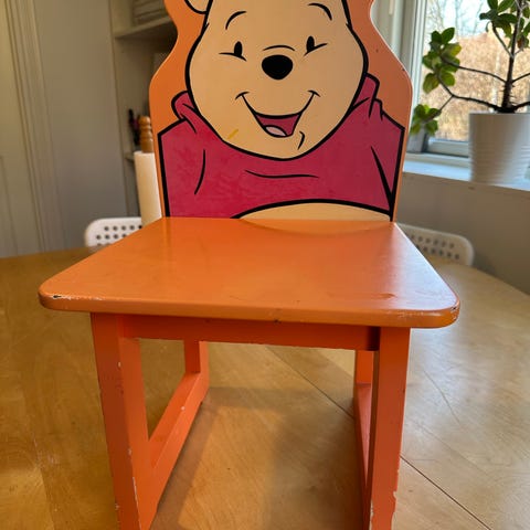 Peter Plys stol - træ - ryglænet kan klappes ned (a.h.t. små børnefingre ville jeg nok skrue det fast)
