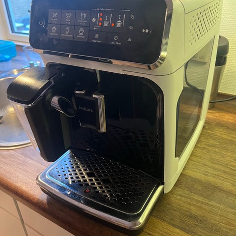 Der er aftagelig drypbakke og adgang til bryggeenheden via sideklap for nem rengøring. Egnet til hele bønner, som males direkte i maskinen, samt til brygning af kaffe med frisk mælk via mælkebeholderen.