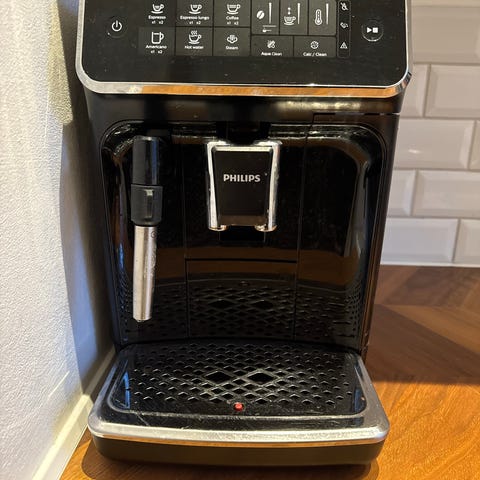 Philips espressomaskine med integreret mælkebeholder i sort/hvid. Maskinen har frontbetjening med touchknapper til valg af forskellige kaffedrikke.