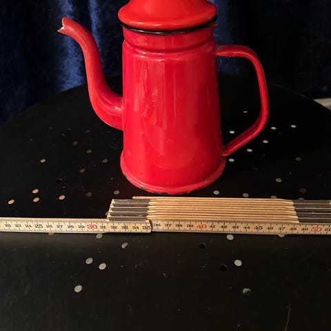 Lille madam blå kaffekande i emalje. Kanden har låg. Dekorativ - men brugbar.
