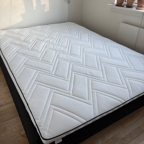 madras i hvid. Rektangulær madras egnet til brug i seng eller gæsteseng. Overfladen har diskret mønster. Medfølgende hvide metaldele kan anvendes som støtte- eller sengekomponenter, afhængigt af sengens opbygning. Velegnet til almindelig indendørs brug i soveværelse eller gæsteværelse. Henvendelse Jeanne i Rødovre skal ned fra 1 sal og der er ikke mulighed for hjælp til at løfte. Ring 28575306. Der har altid været en topmadras på.