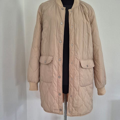 b.young frakke til kvinder i størrelse 42. Frakken er beige og fremstillet i polyester. Den har knaplukning foran, bindebælte i taljen og stropper ved ærmerne. Modellen er velegnet som overgangsfrakke og kan bruges til både hverdag og mere formelle anledninger.