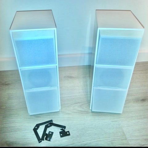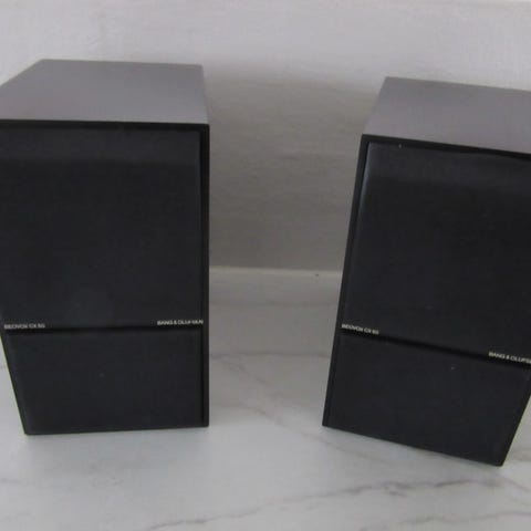 Bang & Olufsen højttalere som bordmodeller i sort. Højttalerne står på metalfødder med rund fodplade og har kubeformede kabinetter med stof- eller gitterfront. De leveres med tilslutningskabler som ses på billedet og er velegnede som kompakte højttalere til brug i stue, kontor eller som del af et eksisterende B&O-anlæg. Sælges for ven.