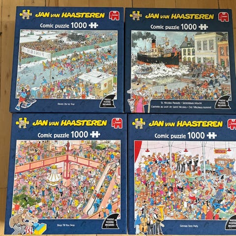 Jan van Haasteren Comic puzzle puslespil med 2 motiver á 1000 brikker. Motiverne forestiller detaljerede, humoristiske scener med mange figurer og aktiviteter. Sættet indeholder i alt 2 puslespil, hver med 1000 brikker, samt en plakat af hvert puslespil.