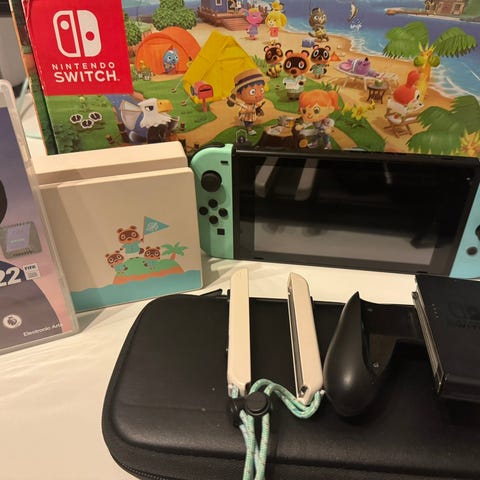 Nintendo Switch Animal Crossing Edition konsol i specialudgave med turkis og grønne Joy-Con controllere. Konsollen har Animal Crossing-motiv på bagsiden og leveres med original emballage. Velegnet til både håndholdt spil og docked spil på tv. Medfølgende etui til opbevaring og transport af konsollen.