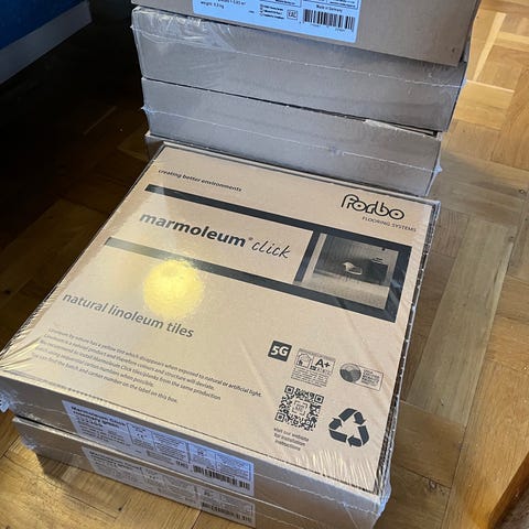 Forbo Marmoleum Click Eternity gulvfliser i linoleum. Fliserne måler 30 x 30 cm og er i en grå nuance. Produktet er klikgulv beregnet til indendørs brug som flydende gulvbelægning. Linoleumsoverfladen er slidstærk og egnet til opholdsrum, køkken eller andre boligområder, hvor der ønskes en plan og rengøringsvenlig overflade. Leveres i kasser med fabriksnummer 333866 og typebetegnelse Marmoleum Click Eternity. 10 kasser af 0.63 m2.