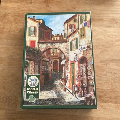 Cobble Hill puslespil med 1000 brikker. Det er et rigtigt hyggeligt puslespil. Brikkerne er af god kvalitet og skåret lidt anderledes.
