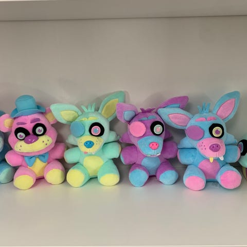 4 Bamser allesammen med Blacklight tema baseret på spillet Five Nights at Freddy’s Security Breach produceret af Funko: