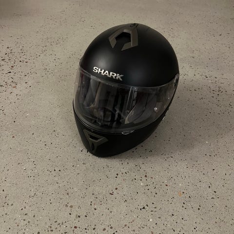 Shark motorcykelhjelm i fuldface-design i hvid med sort grafisk dekoration. Hjelmen har klart visir samt integreret mørkt solvisir. Der er ventilationsåbninger for og bag på hjelmen. Velegnet som helhjelm til motorcykel- eller scooterkørsel.