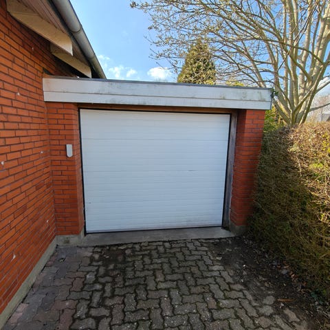 Garageport med portåbner. Porten ses som en sektionalport med vandrette sektioner og rektangulære felter. Indvendigt er der monteret en elektrisk portåbner i loftet med skinner langs loftet. Der medfølger fjernbetjening til åbning og lukning af porten. Porten fremstår i en mørk farve udvendigt. Velegnet til lukning af garage eller carport, hvor der ønskes automatisk åbne- og lukkefunktion.