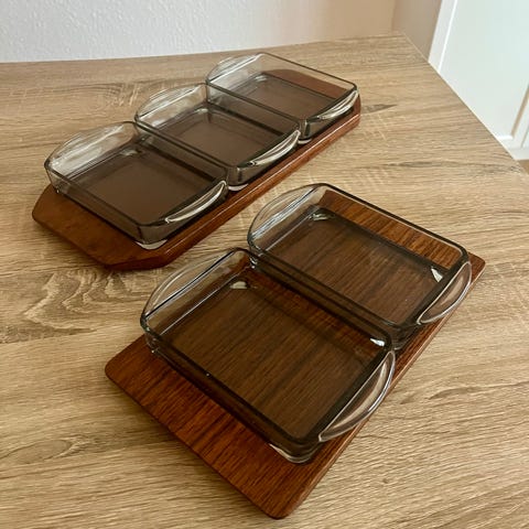 Kabaretfad i teak og sandsynligvis Holmegaard eller Kastrup glas fade (se made in Denmark)